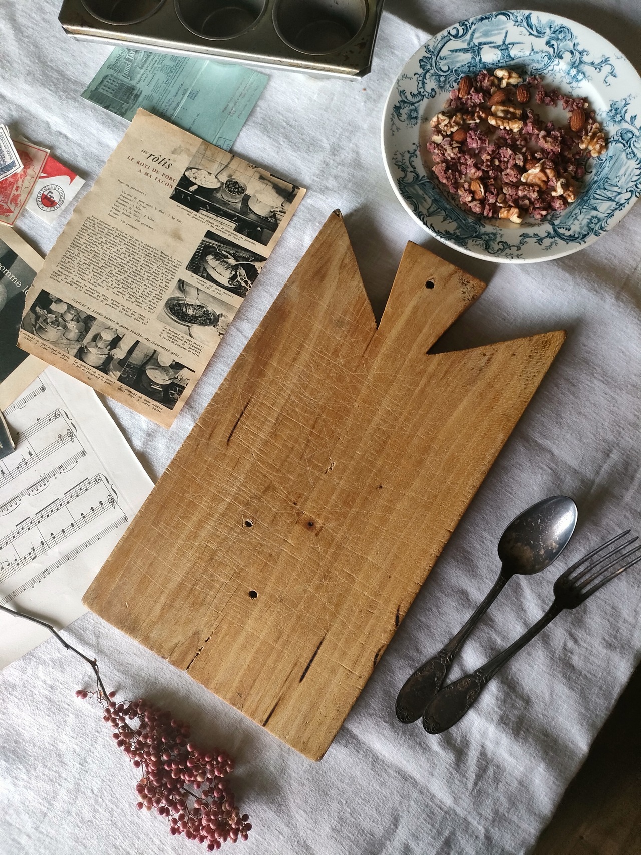 所々に深い傷跡、片面にハンドメイドの際と思われる、ふたつの穴がございます。実用はもちろん可能でございますが、アンティークの風合いと感じていただけるかたへお届けできればと想います。お菓子を作ったりお料理をする時間が、ますます心躍る瞬間になりますように…。