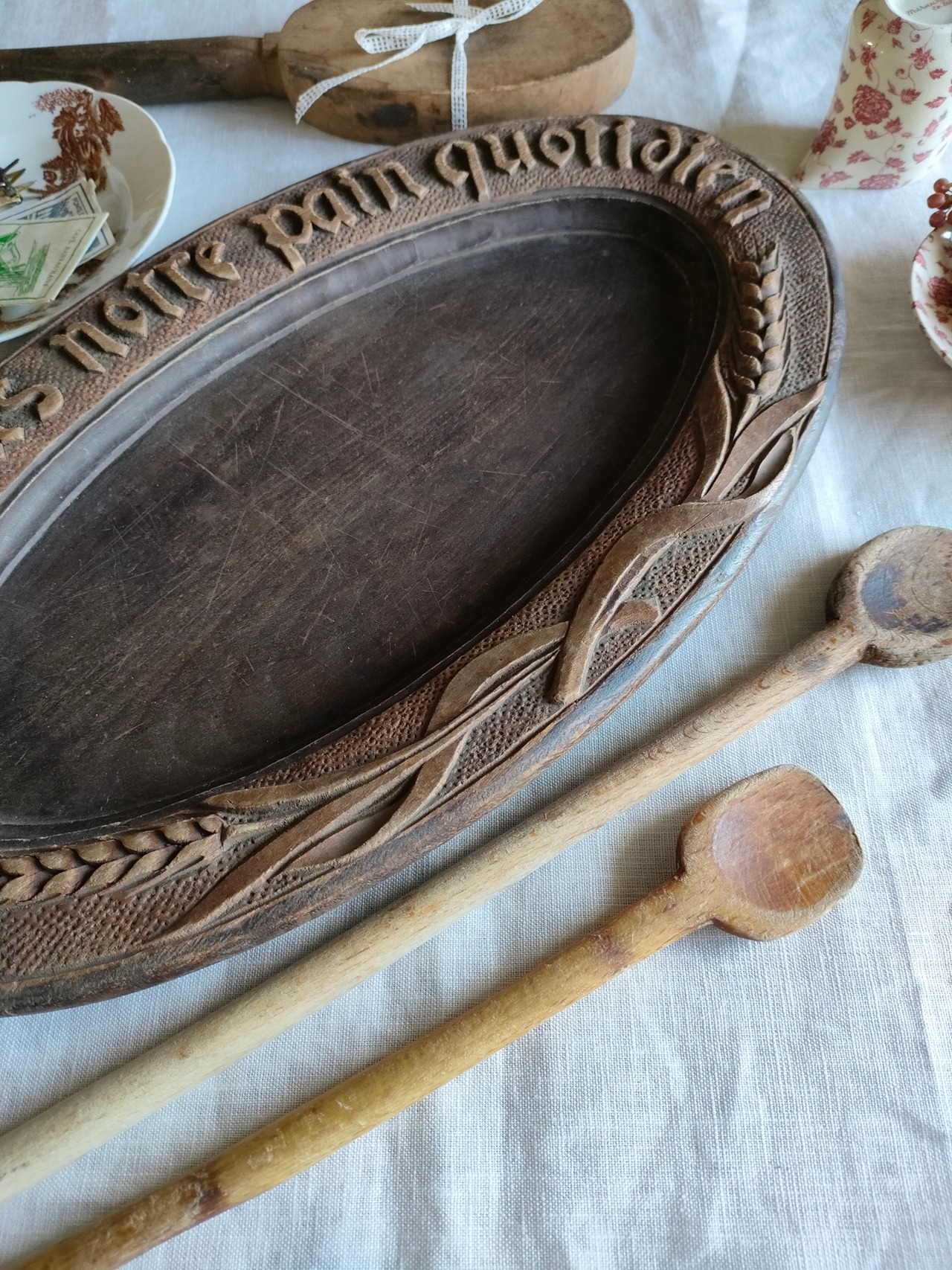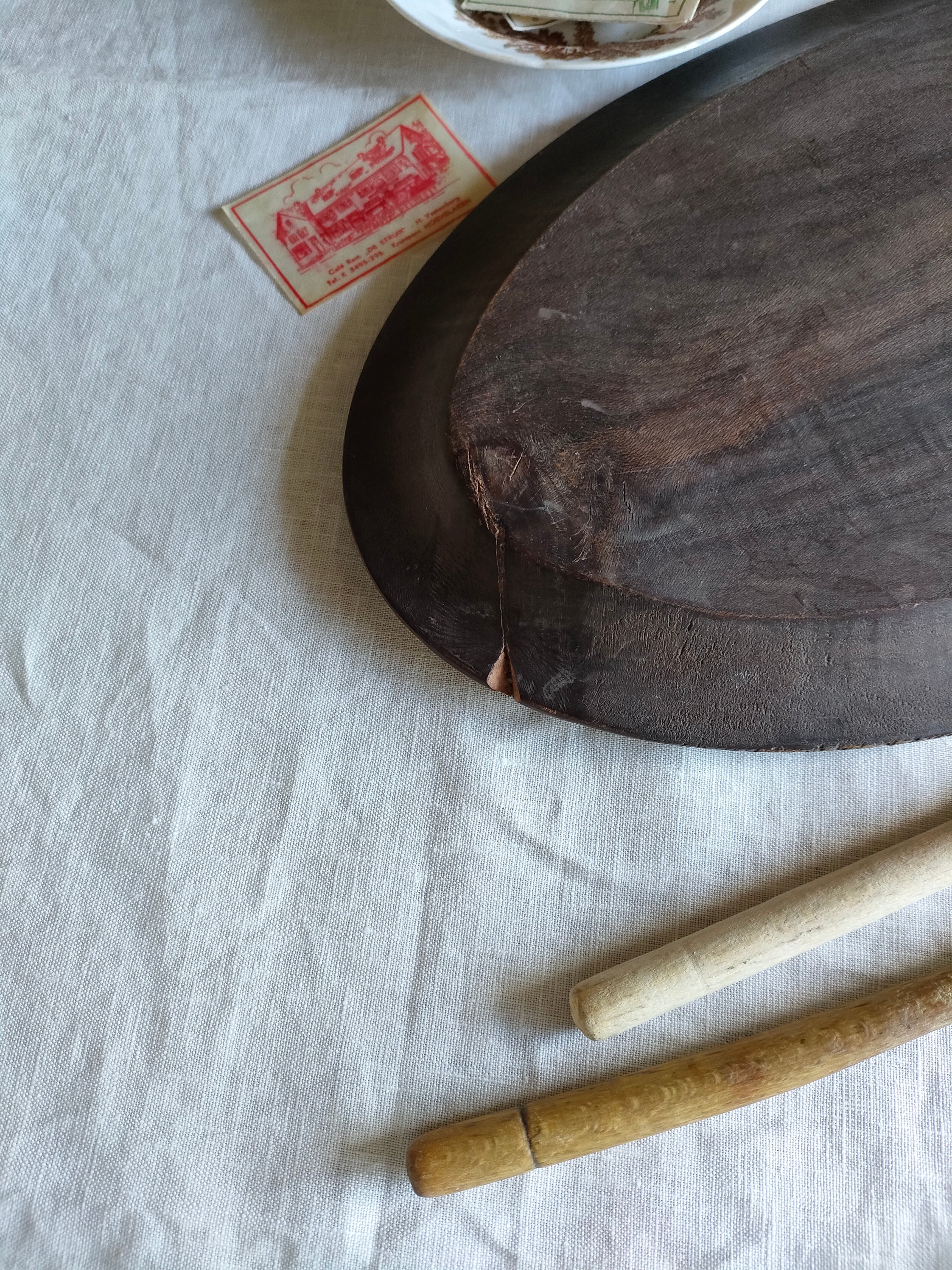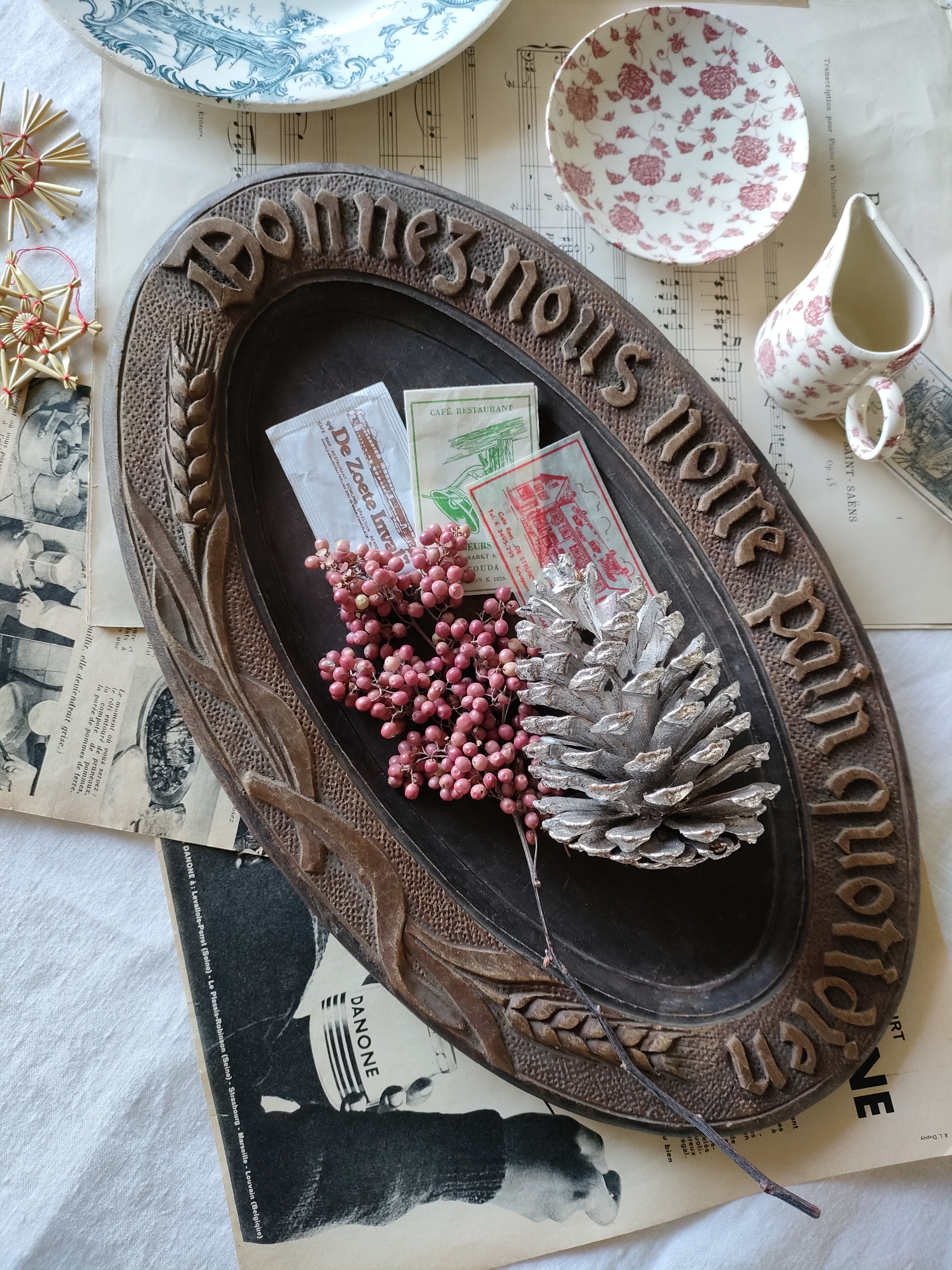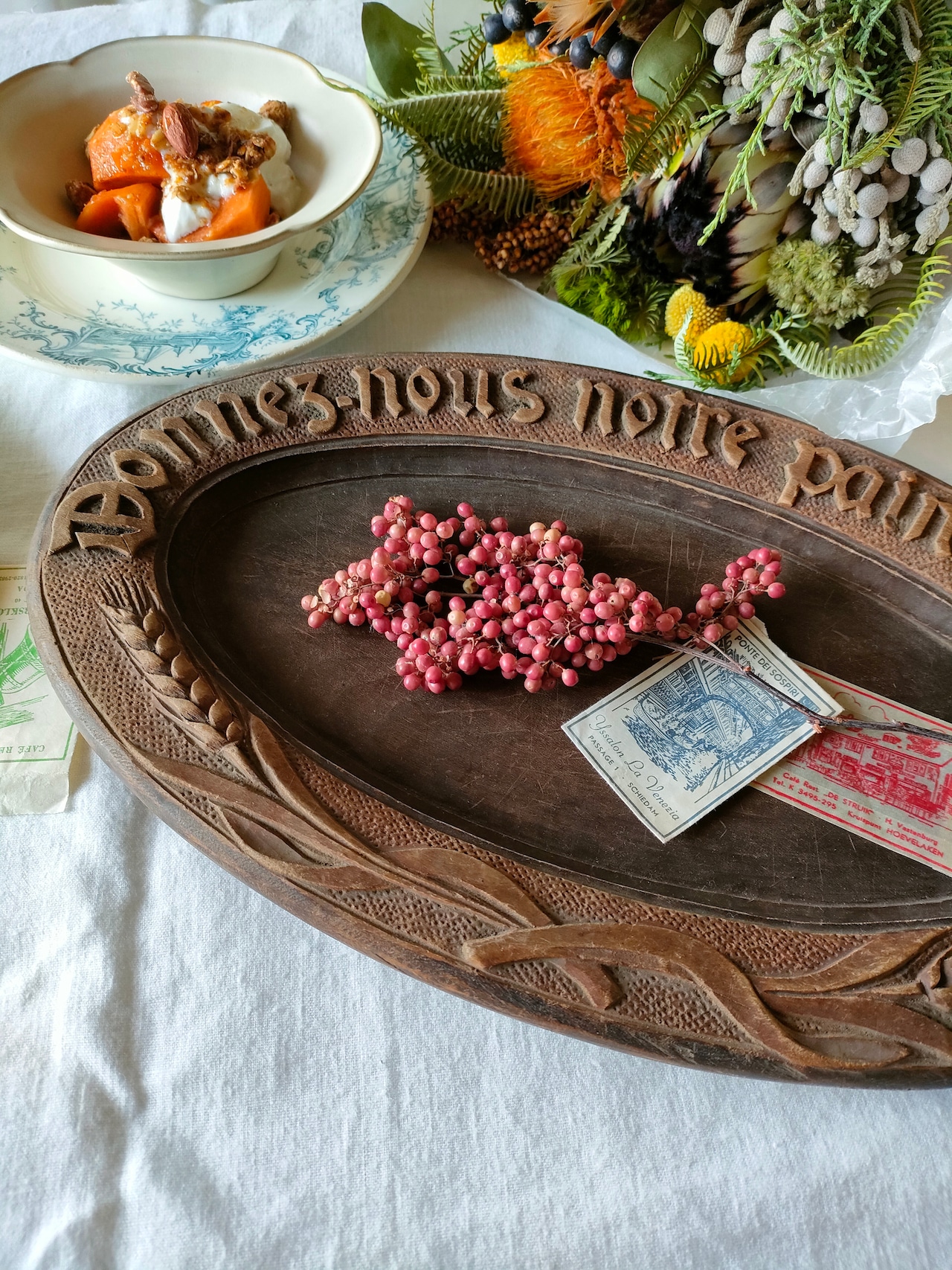 楕円型は珍しく、稀少なアンティークのため、出会えたときは店主自身も心からときめきました。テーブルにひと際存在感を放つブレッドボード、パンはもちろん、チーズやフルーツ、お菓子を存分に引き立たせてくれる存在です。