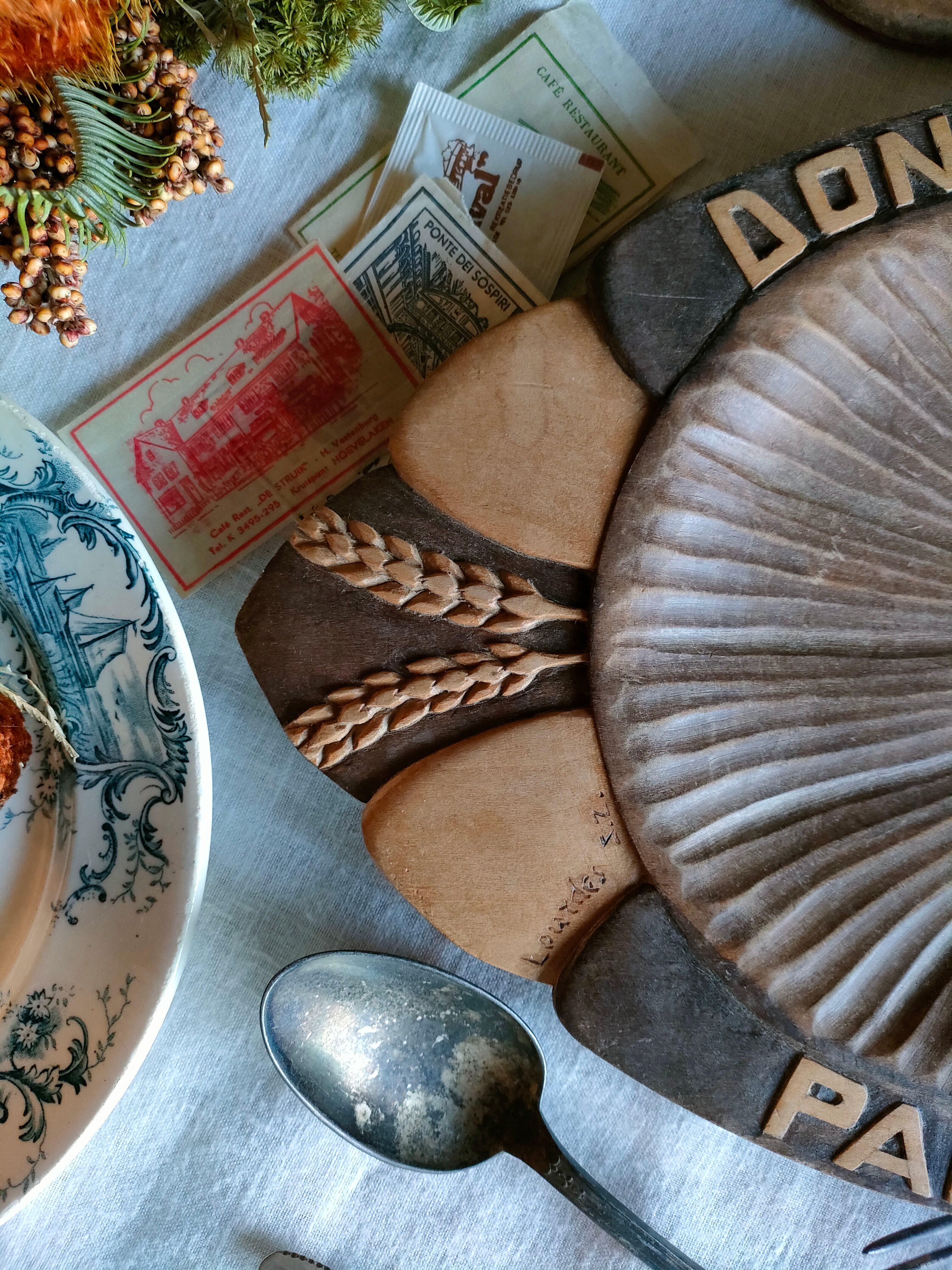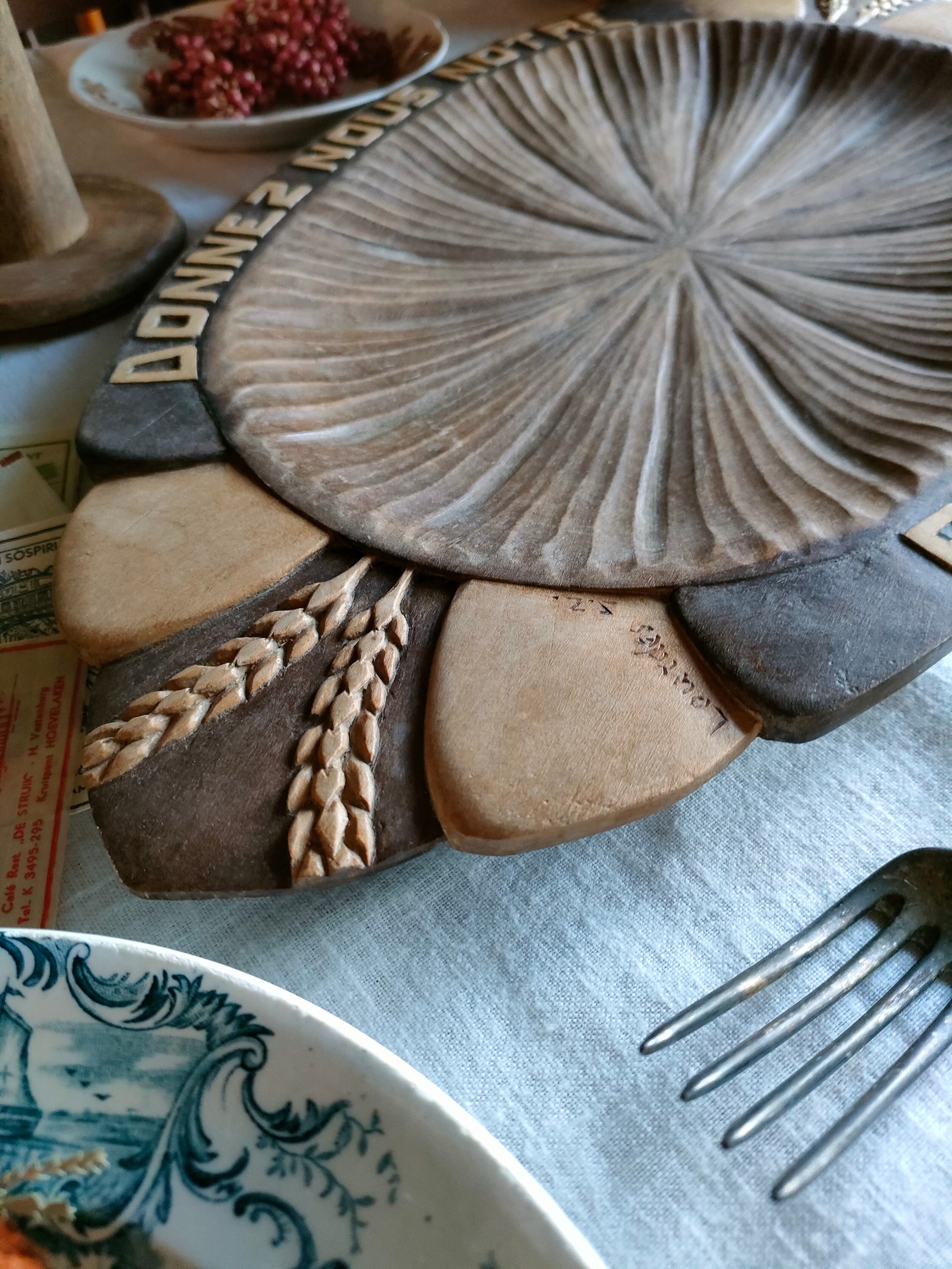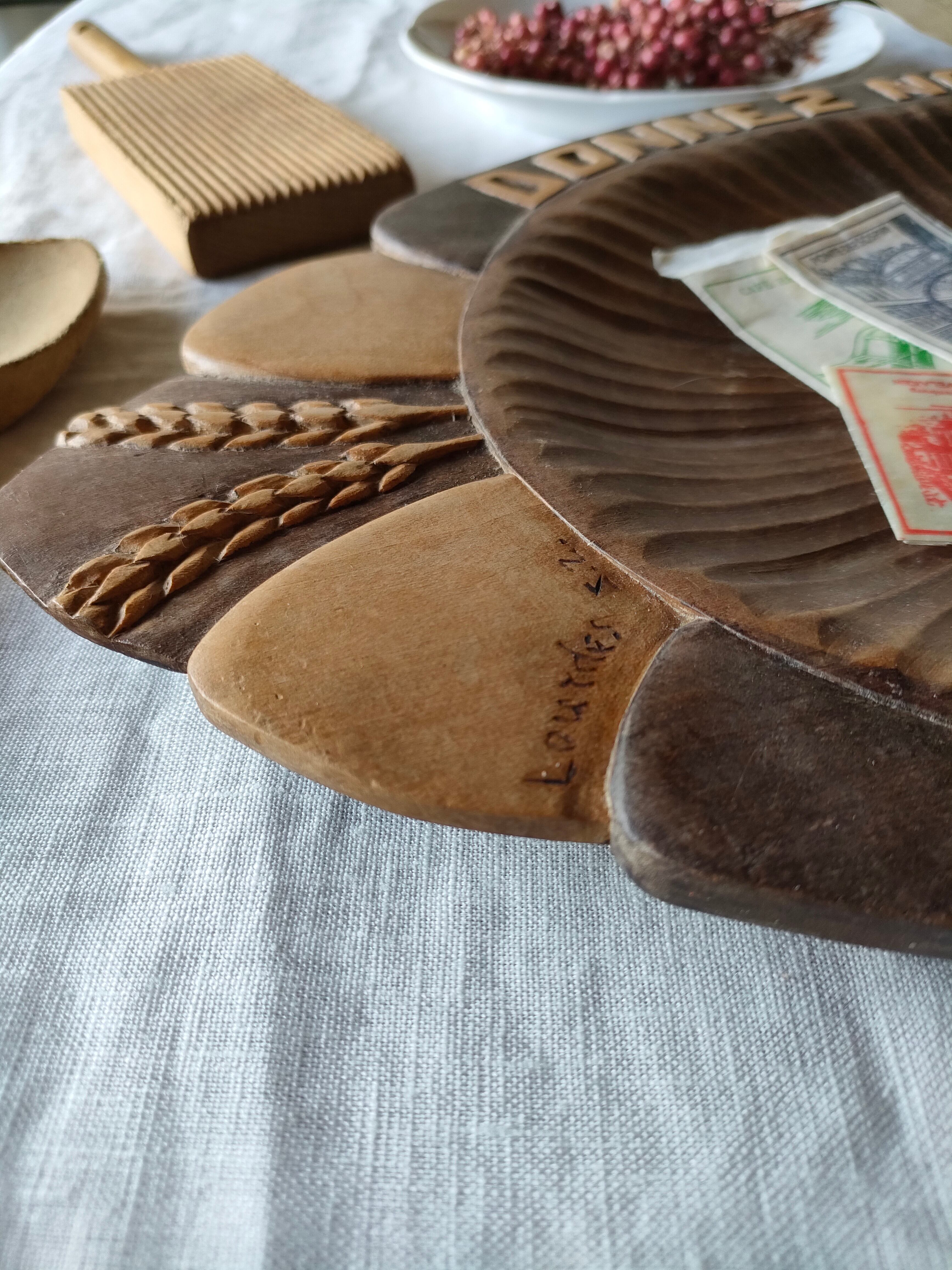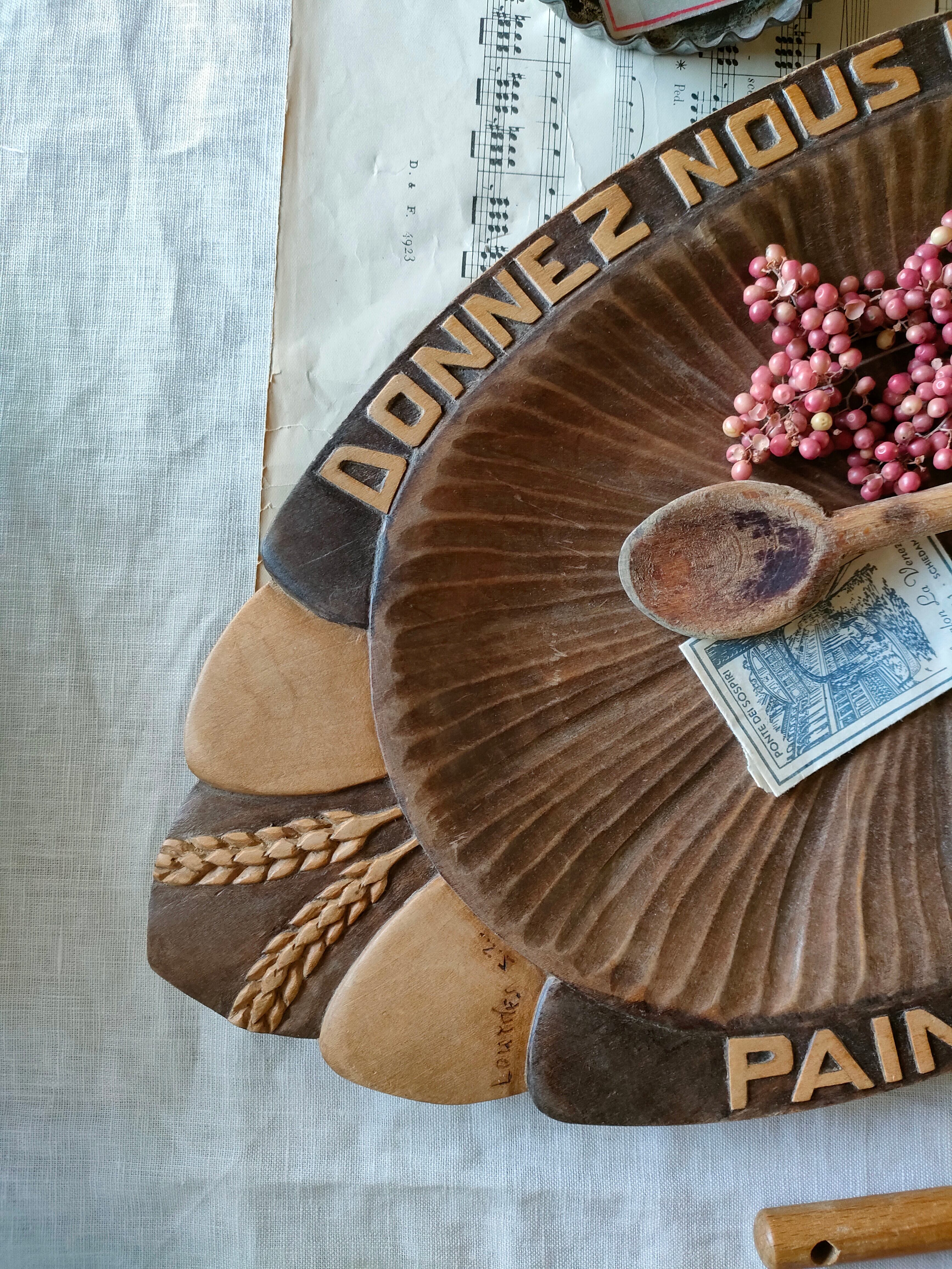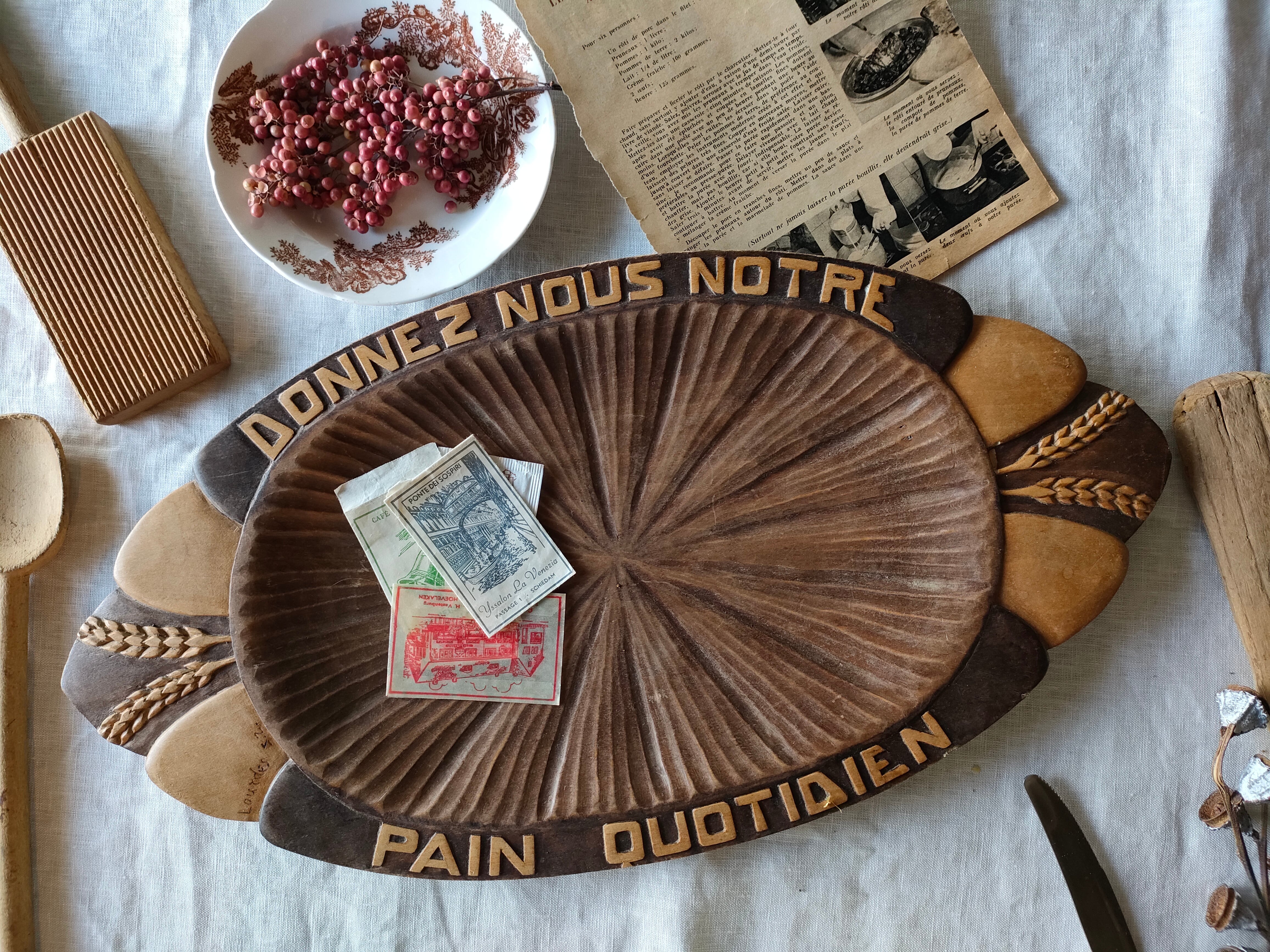 麦の穂のデザインとともに、フランスのブレットボードにはこんな祈りの文字が刻まれています。【モノ】に込められた想いや、物語を想像することで古いものに対する愛おしい気持ちや、大切に残したいという気持ちがますます大きくなりますね。