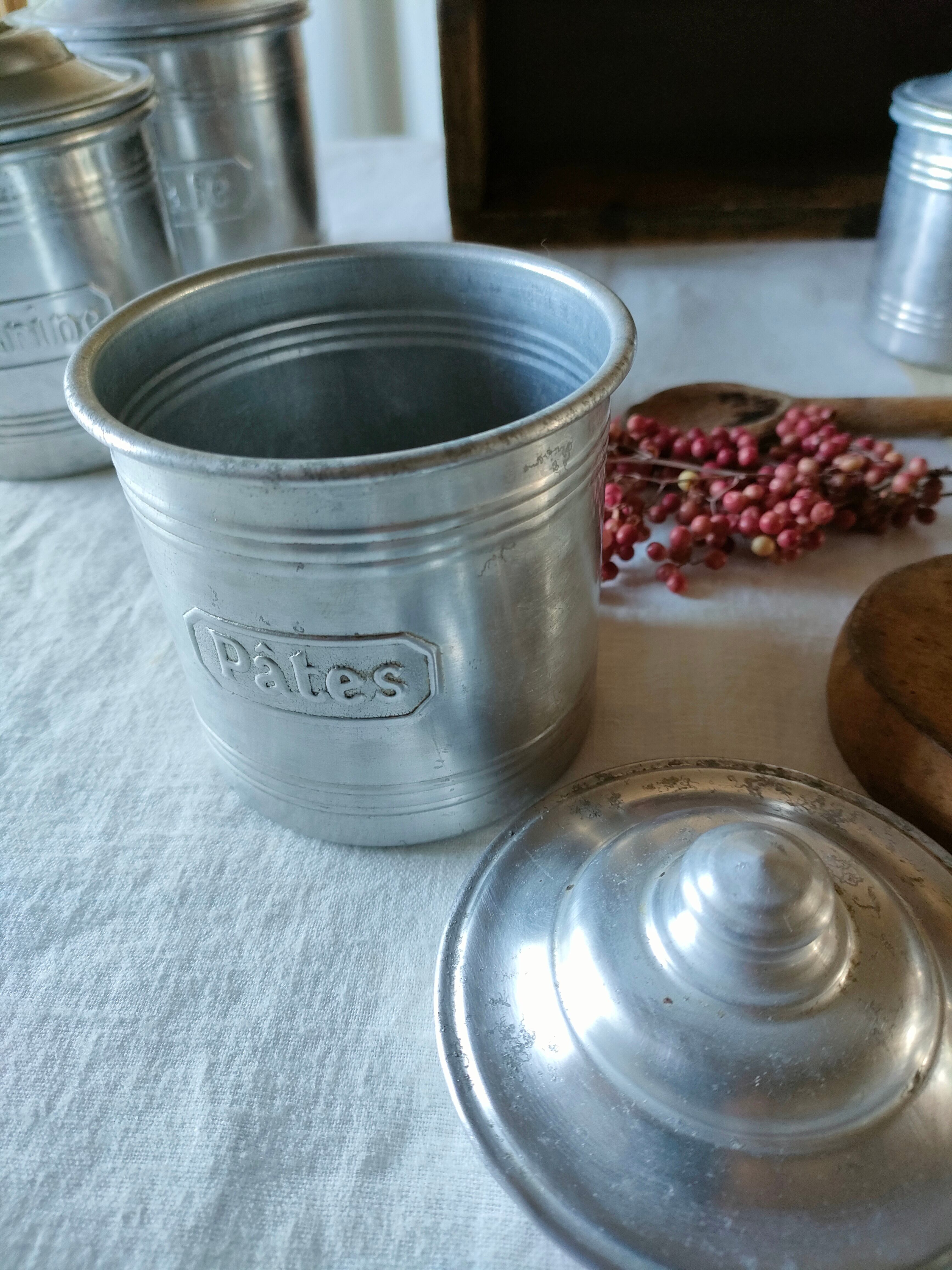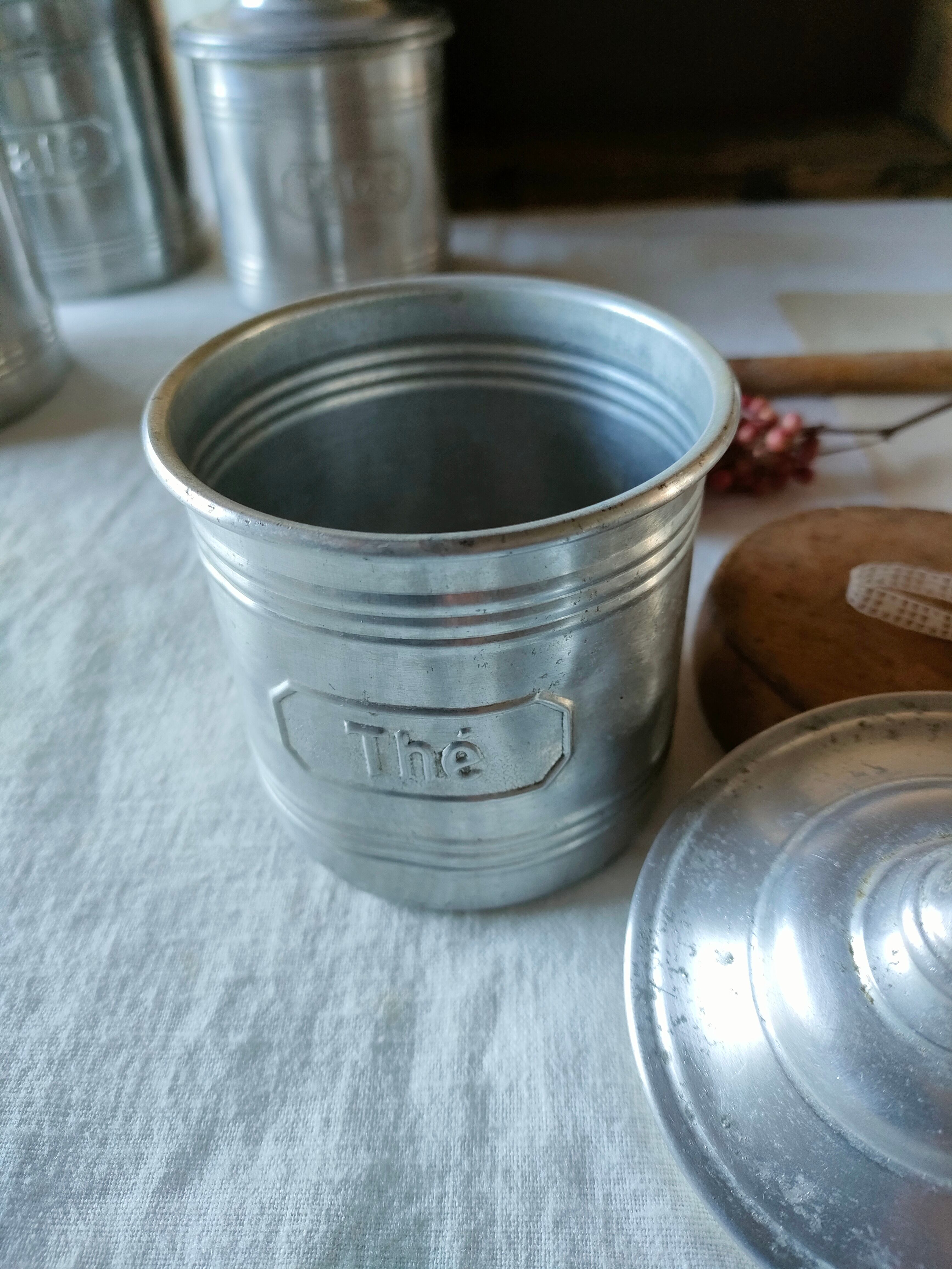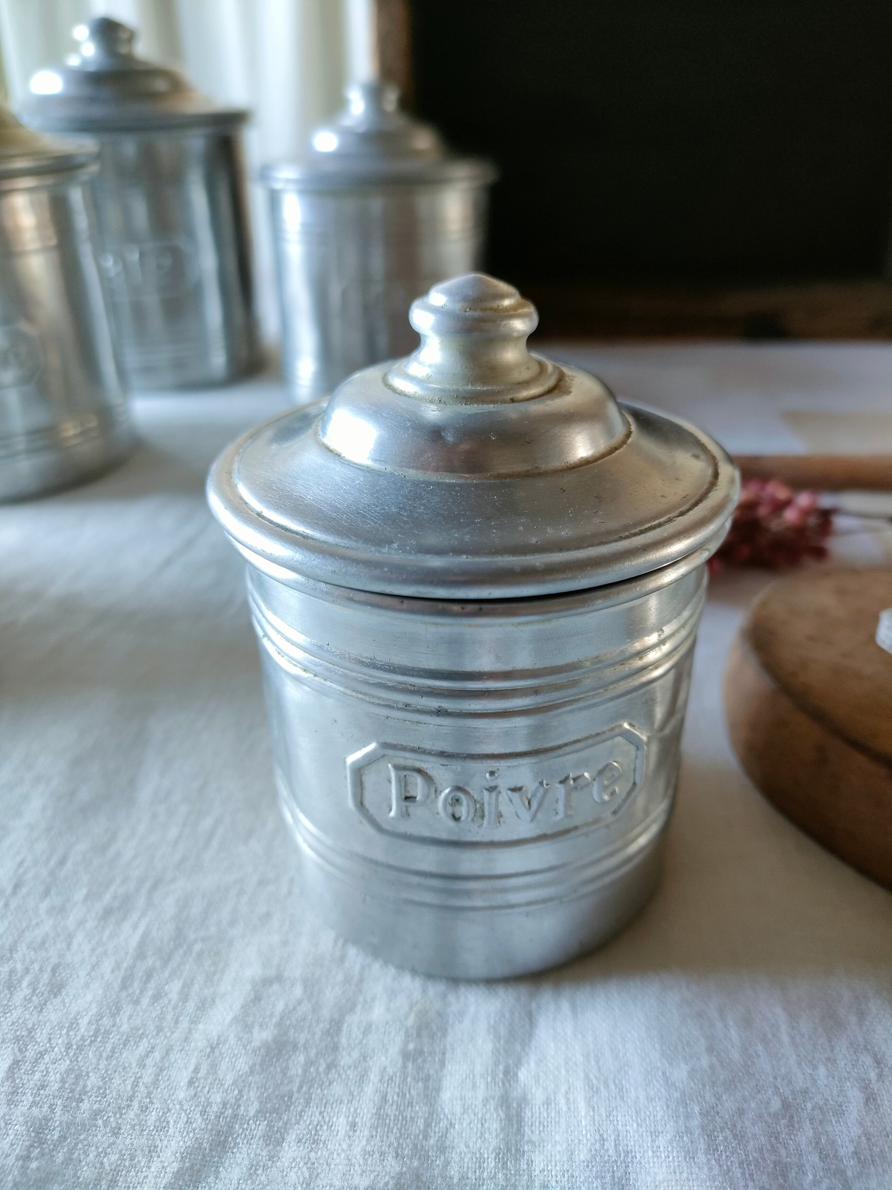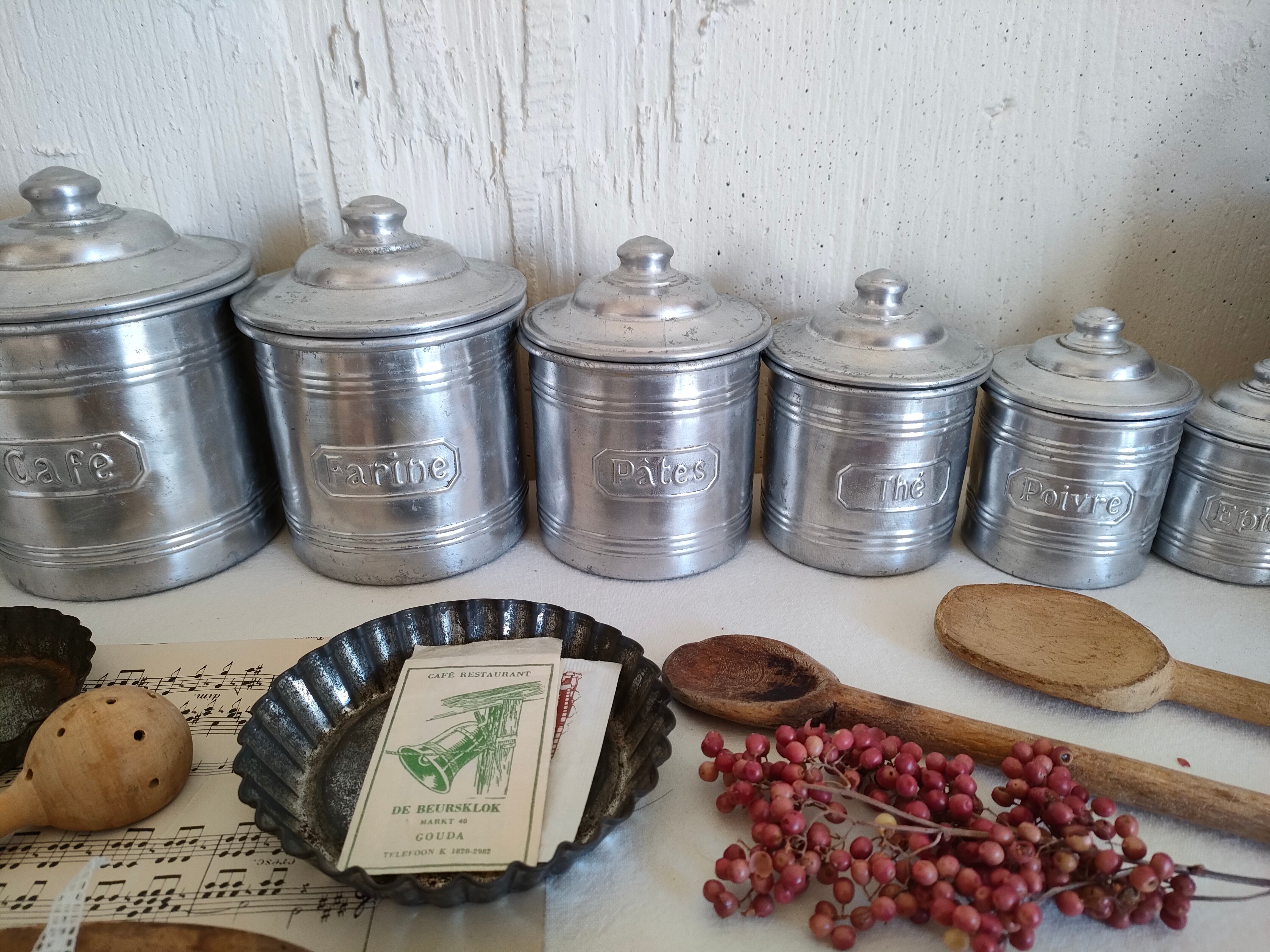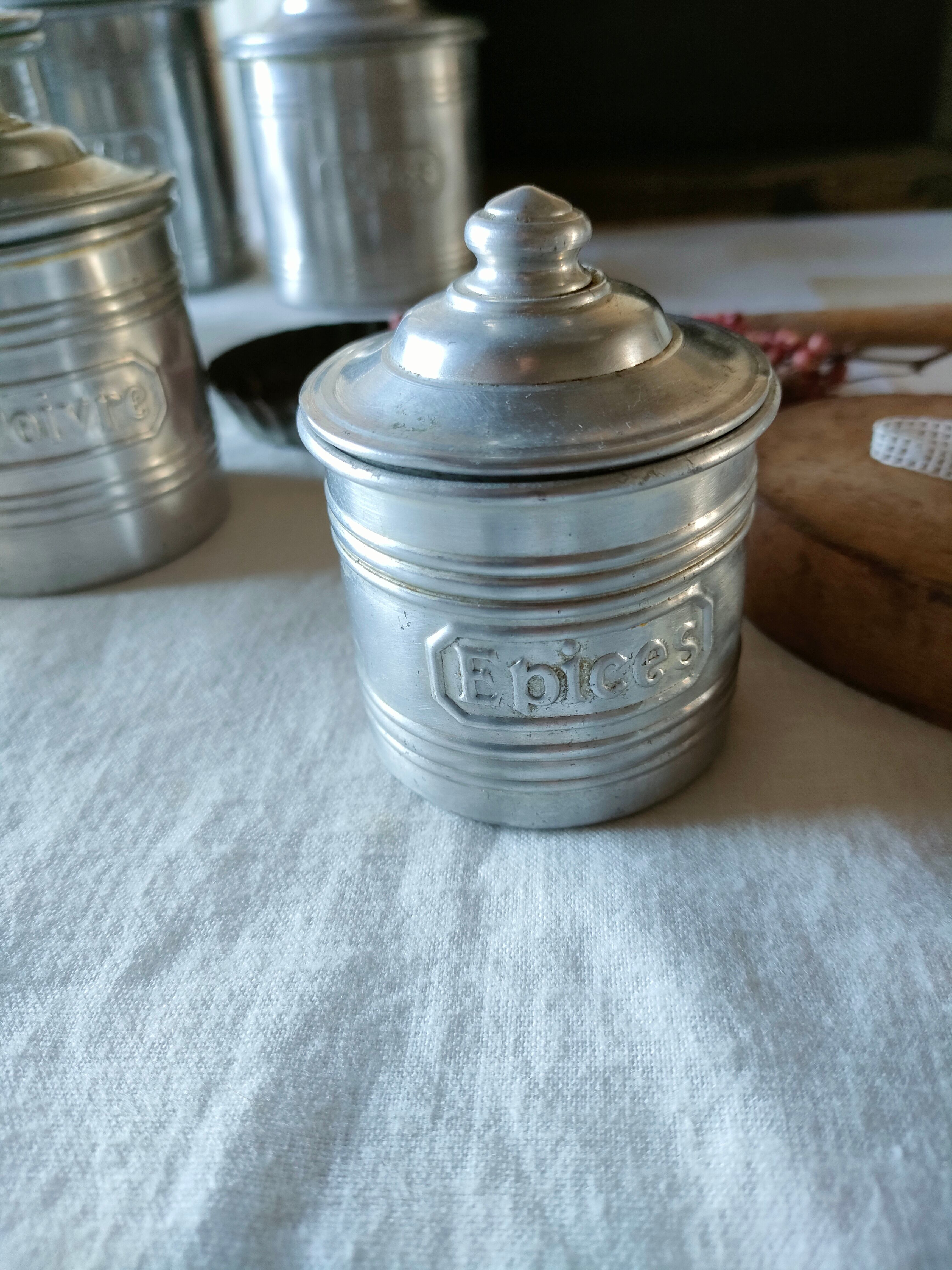 フランスの古いアンティークのアルミのスパイスキャニスターです。