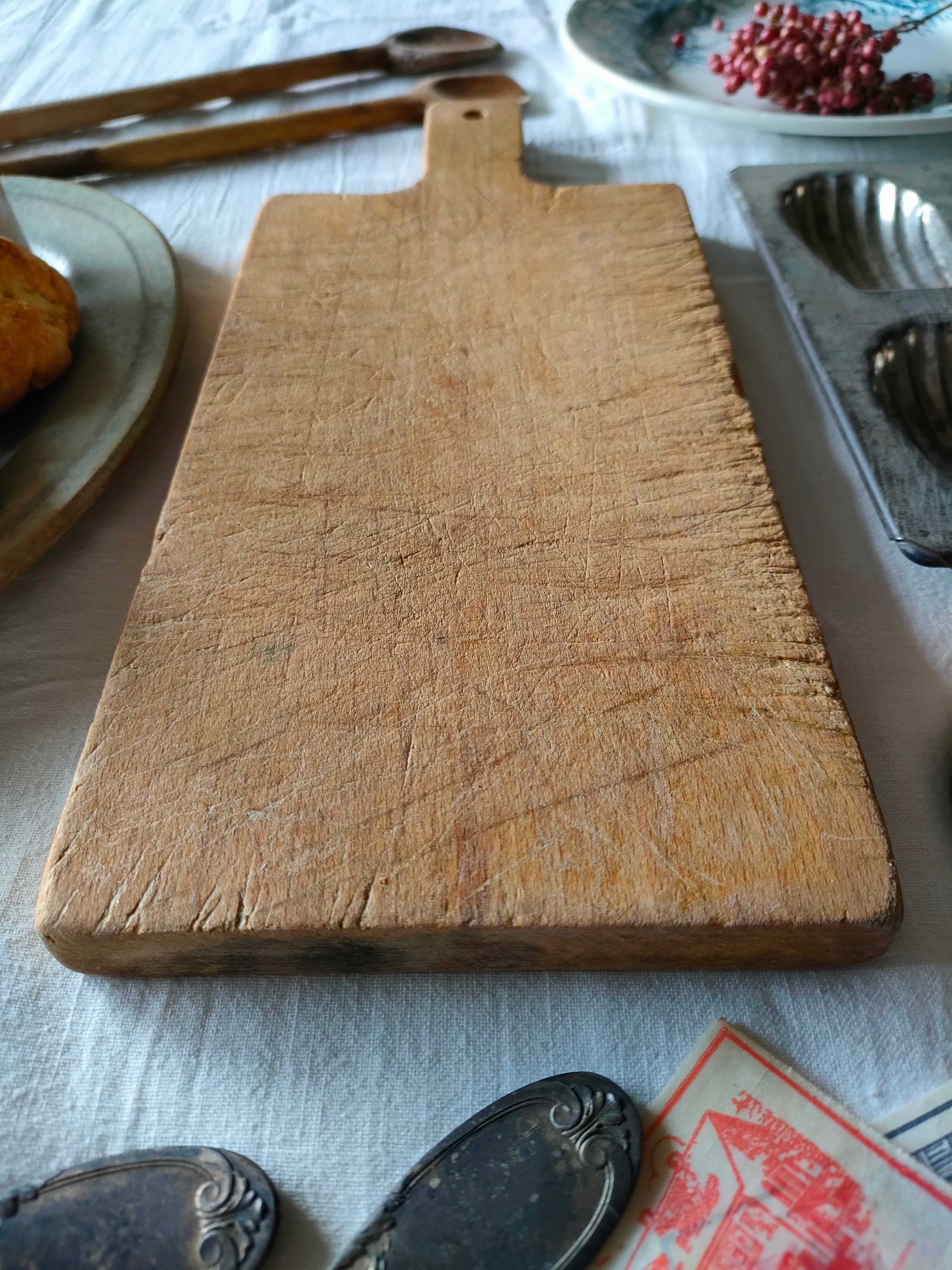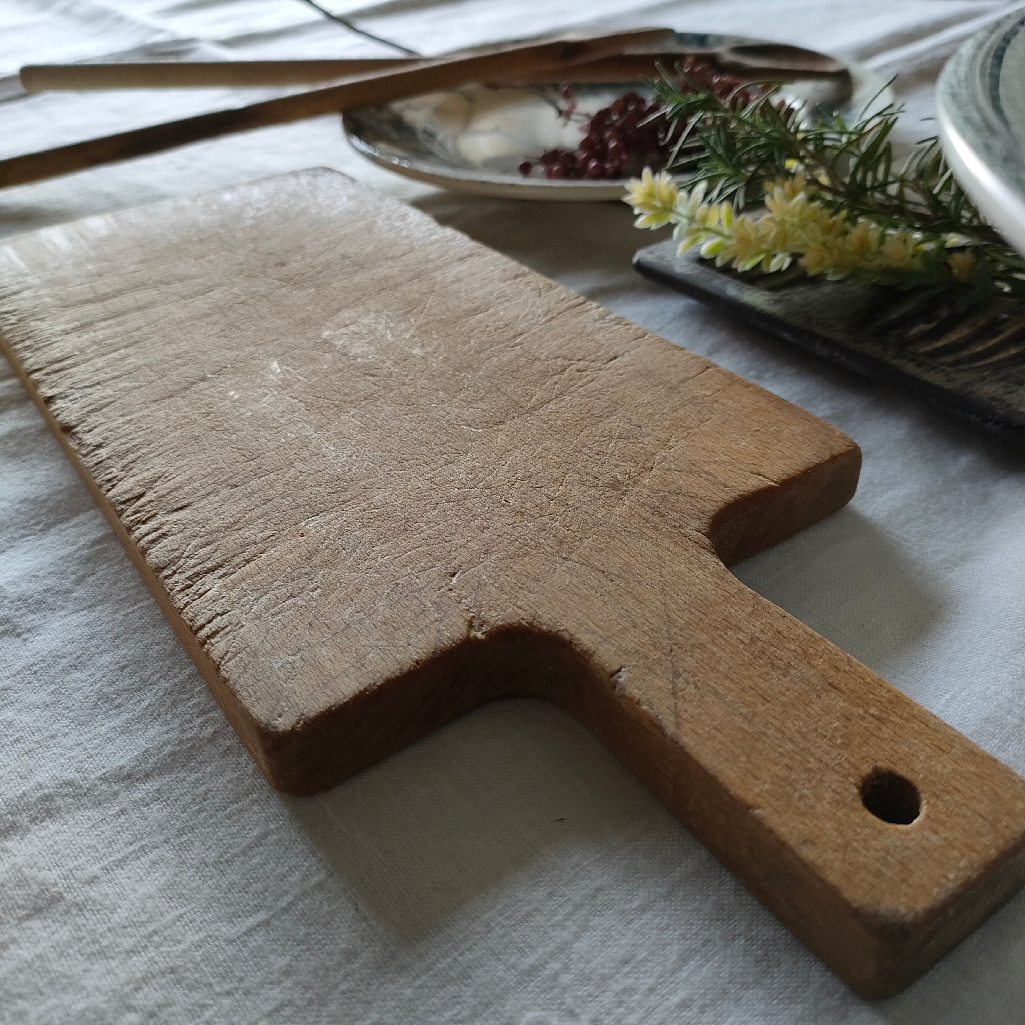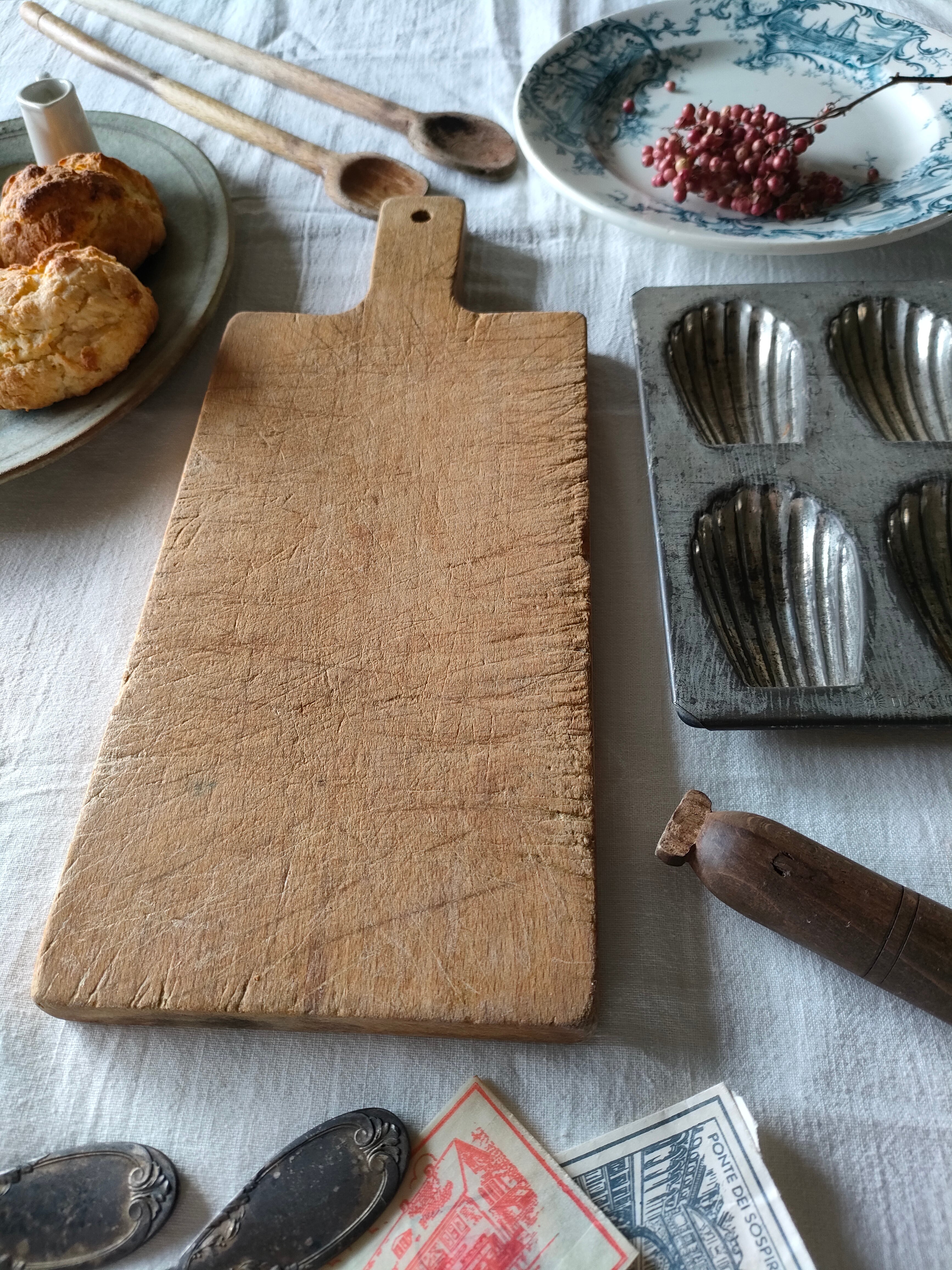 深く刻み込まれた傷跡が、とても美しいアンティークのカッティングボードは、はるばるフランスから届きました。
