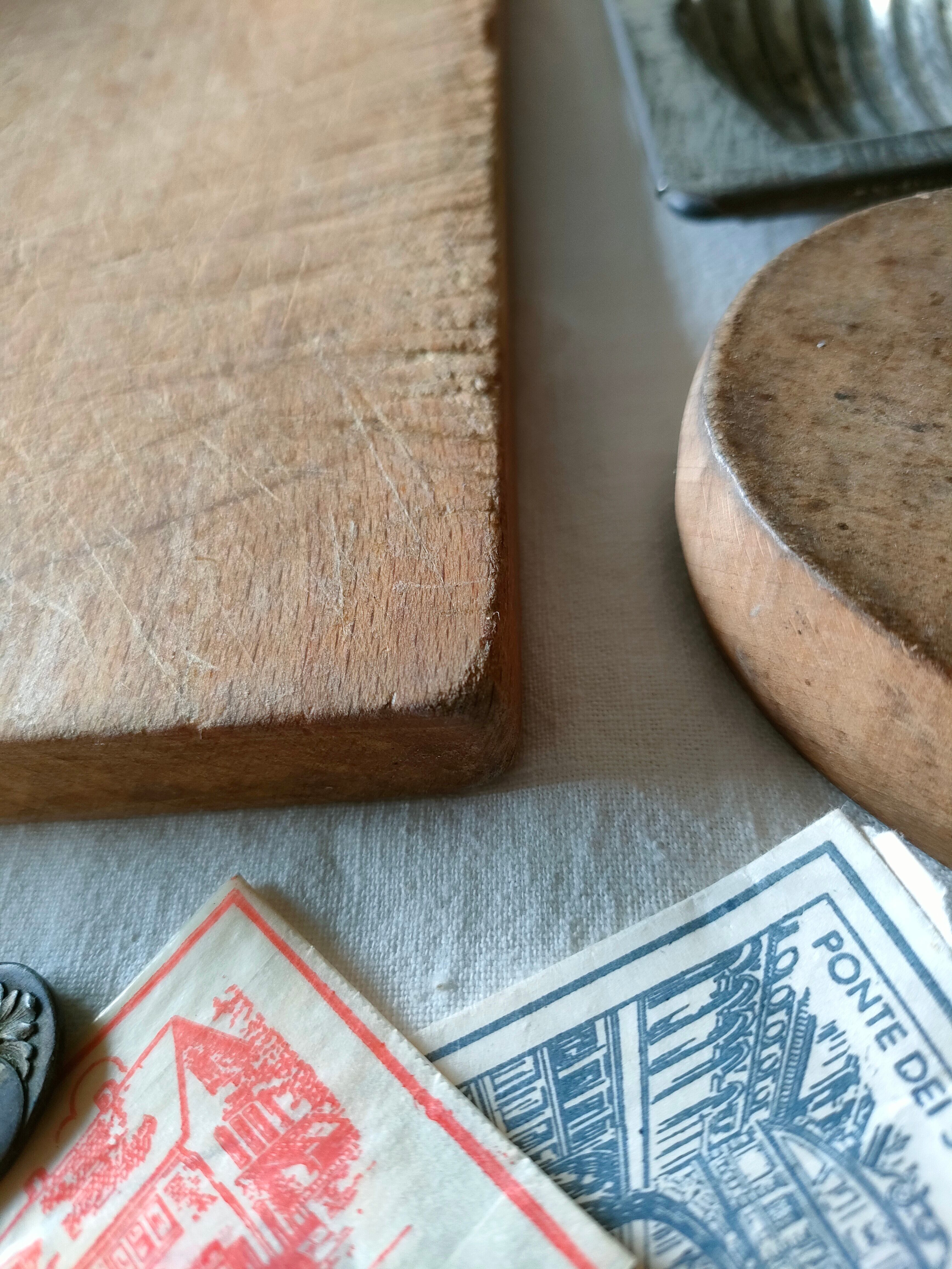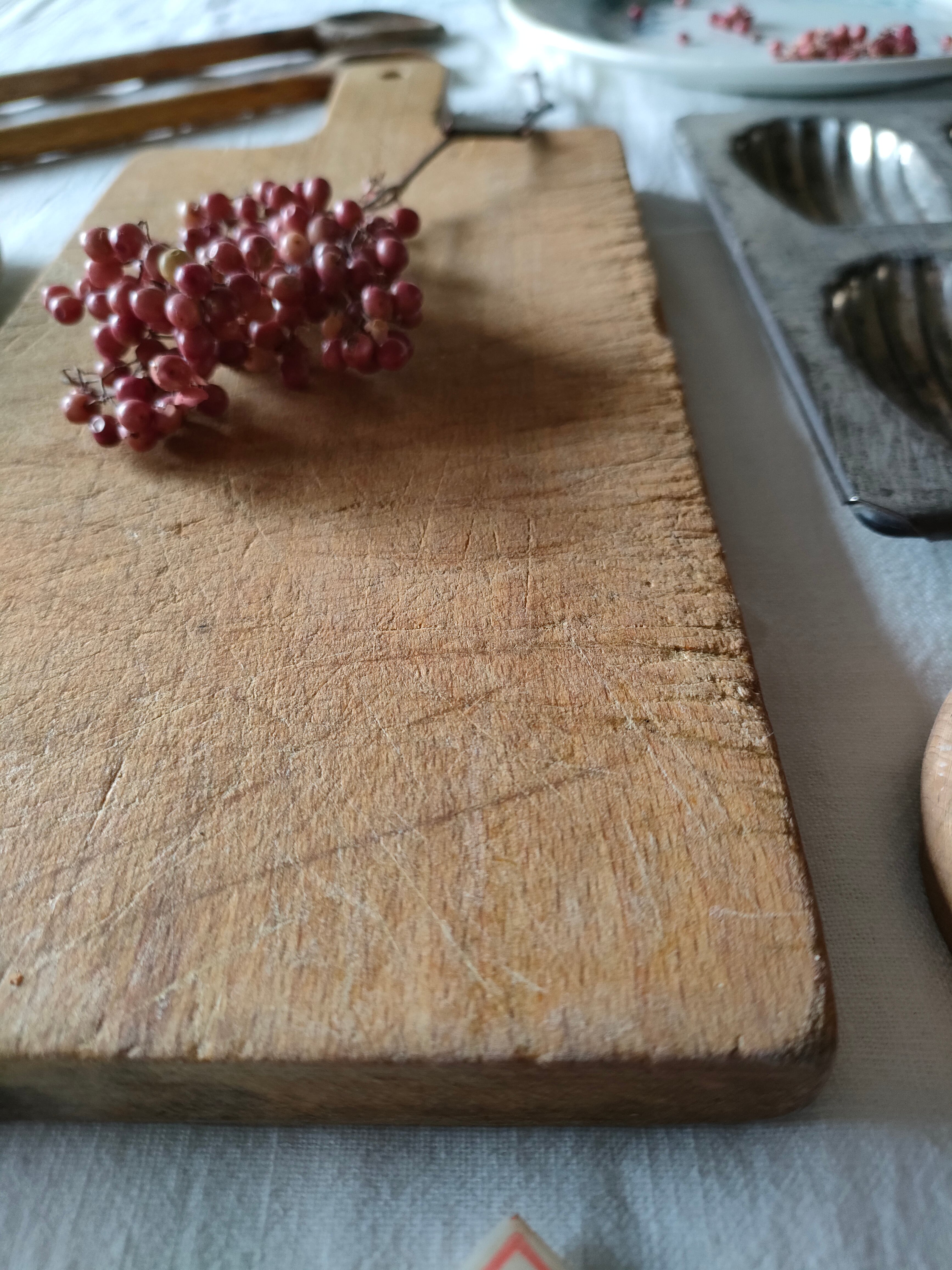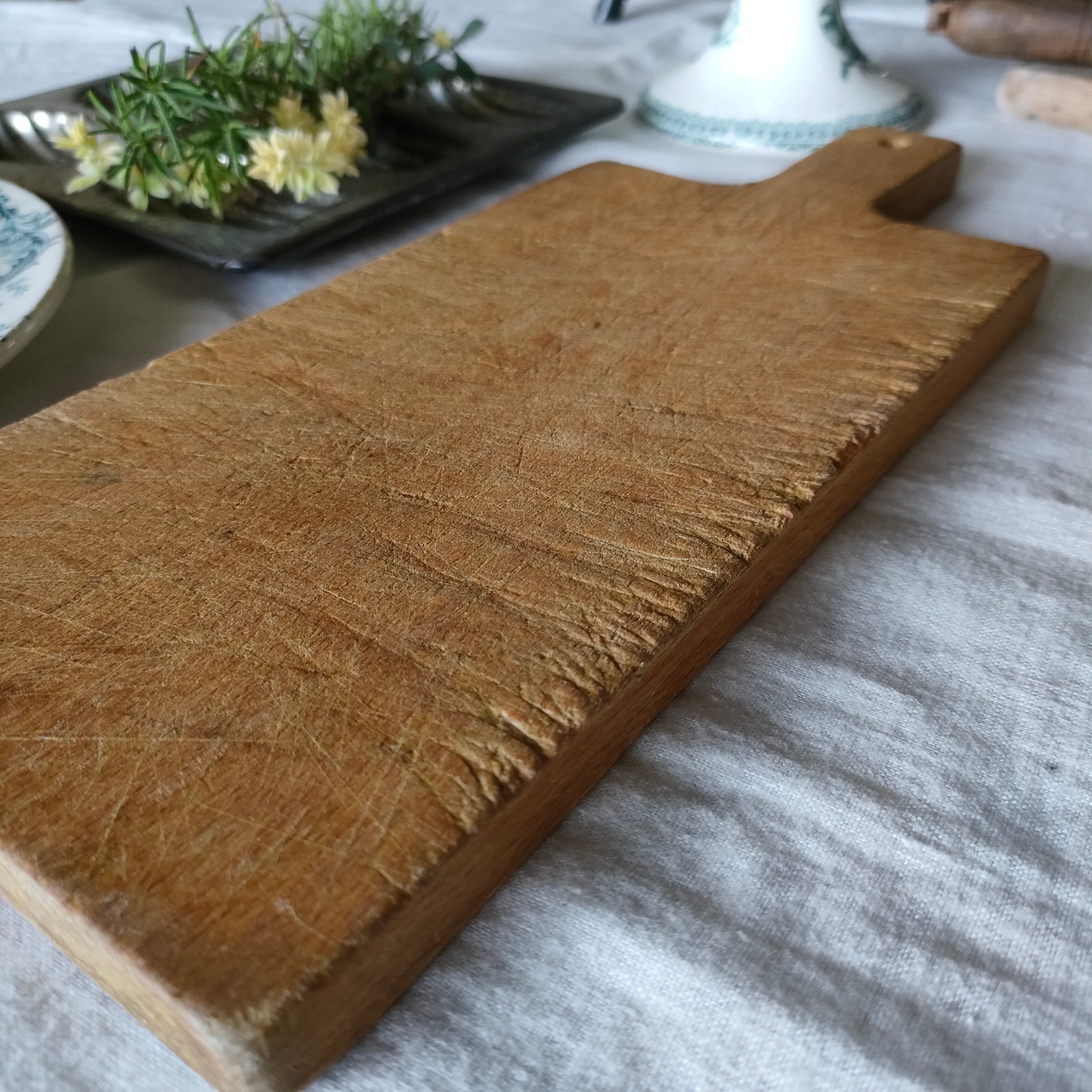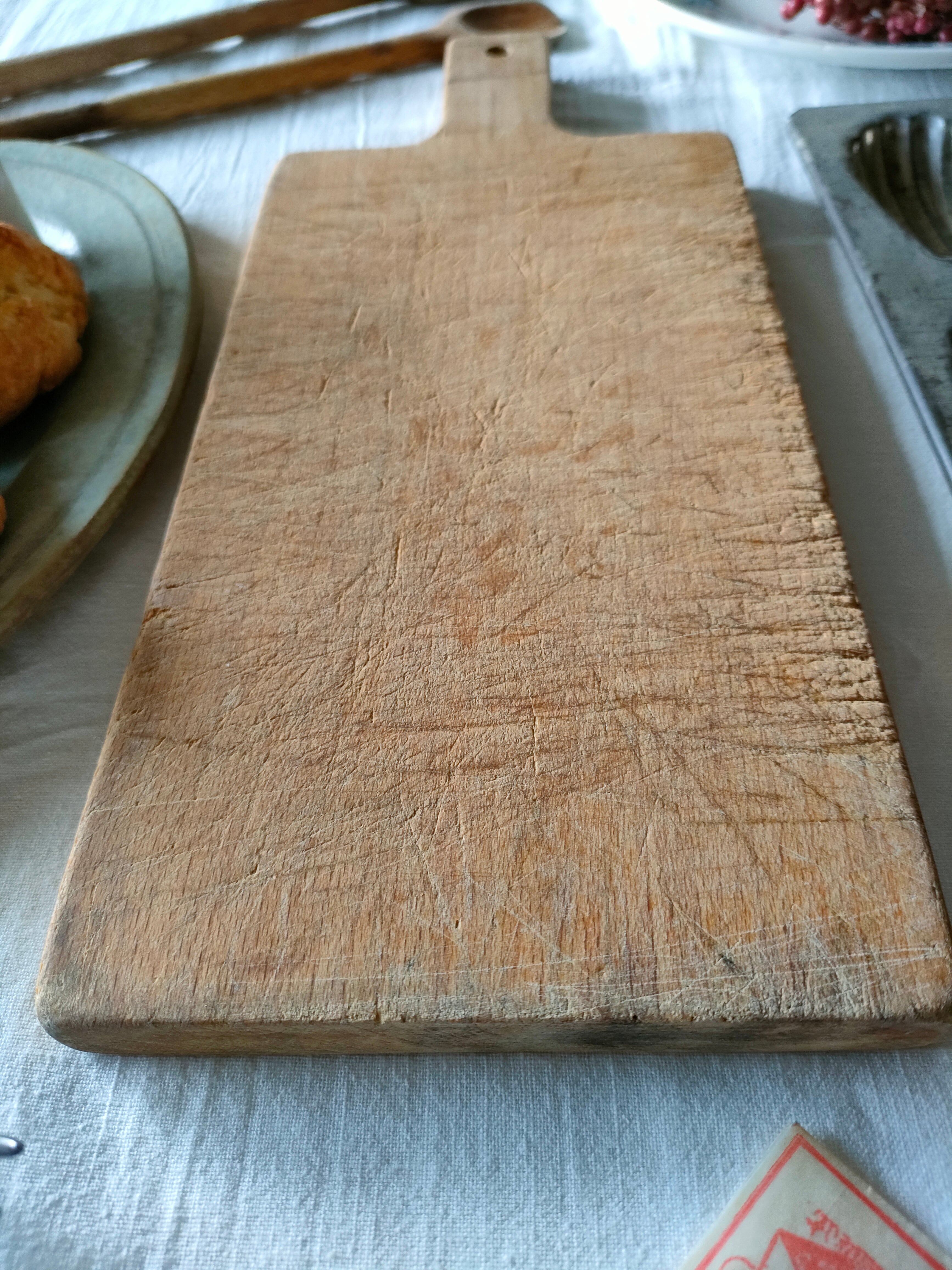 深く刻み込まれた傷跡が、とても美しいアンティークのカッティングボードは、はるばるフランスから届きました。