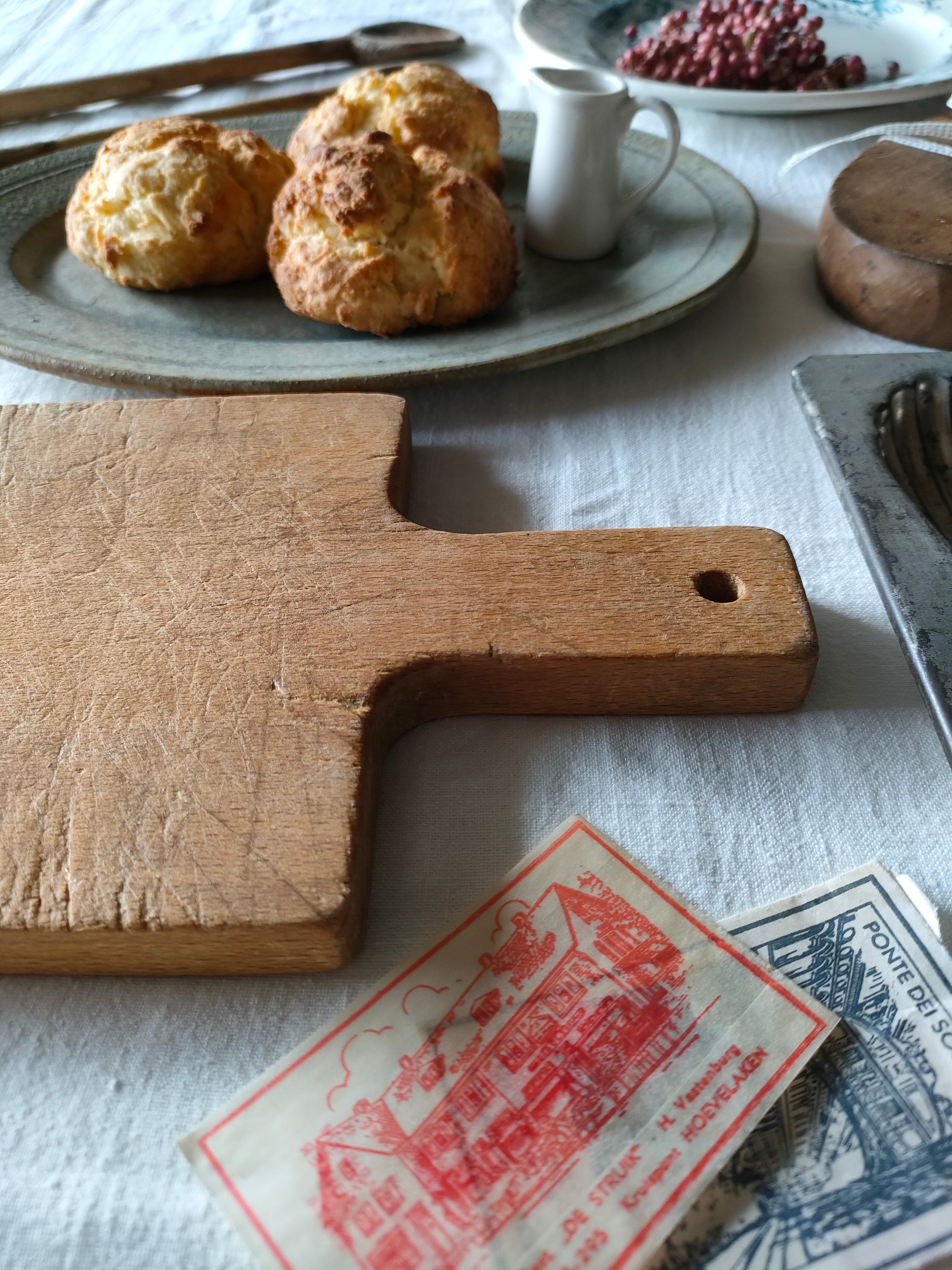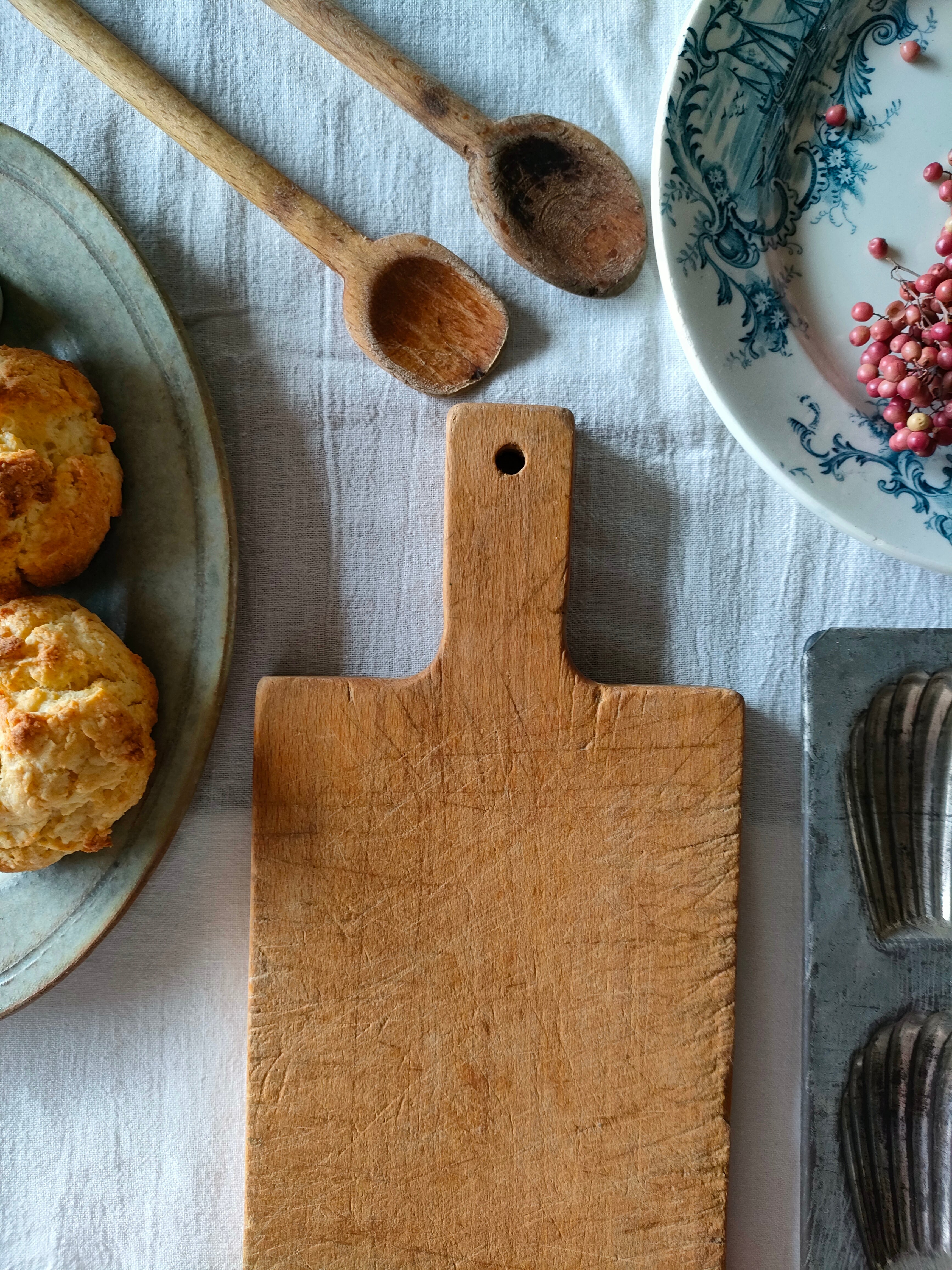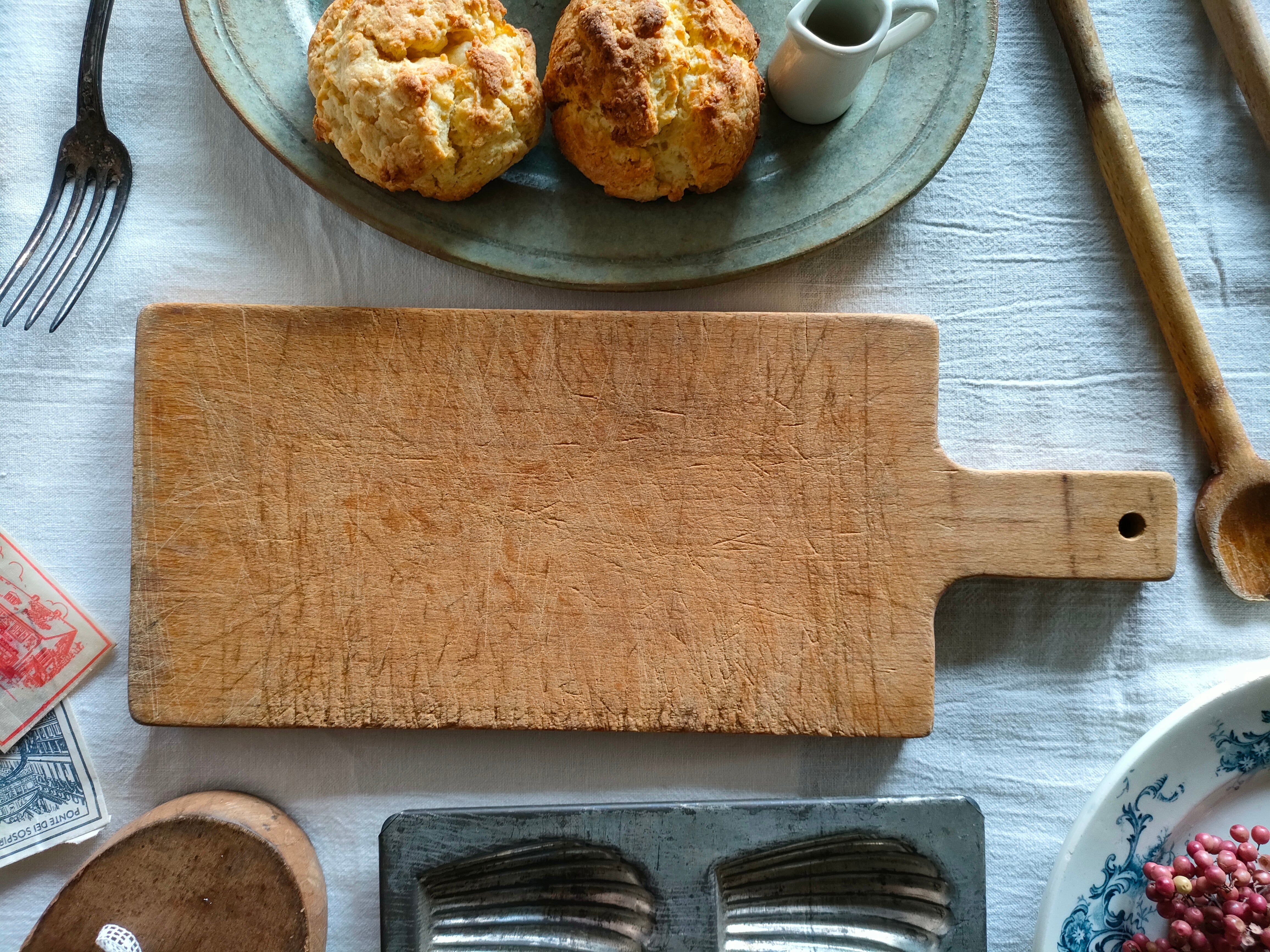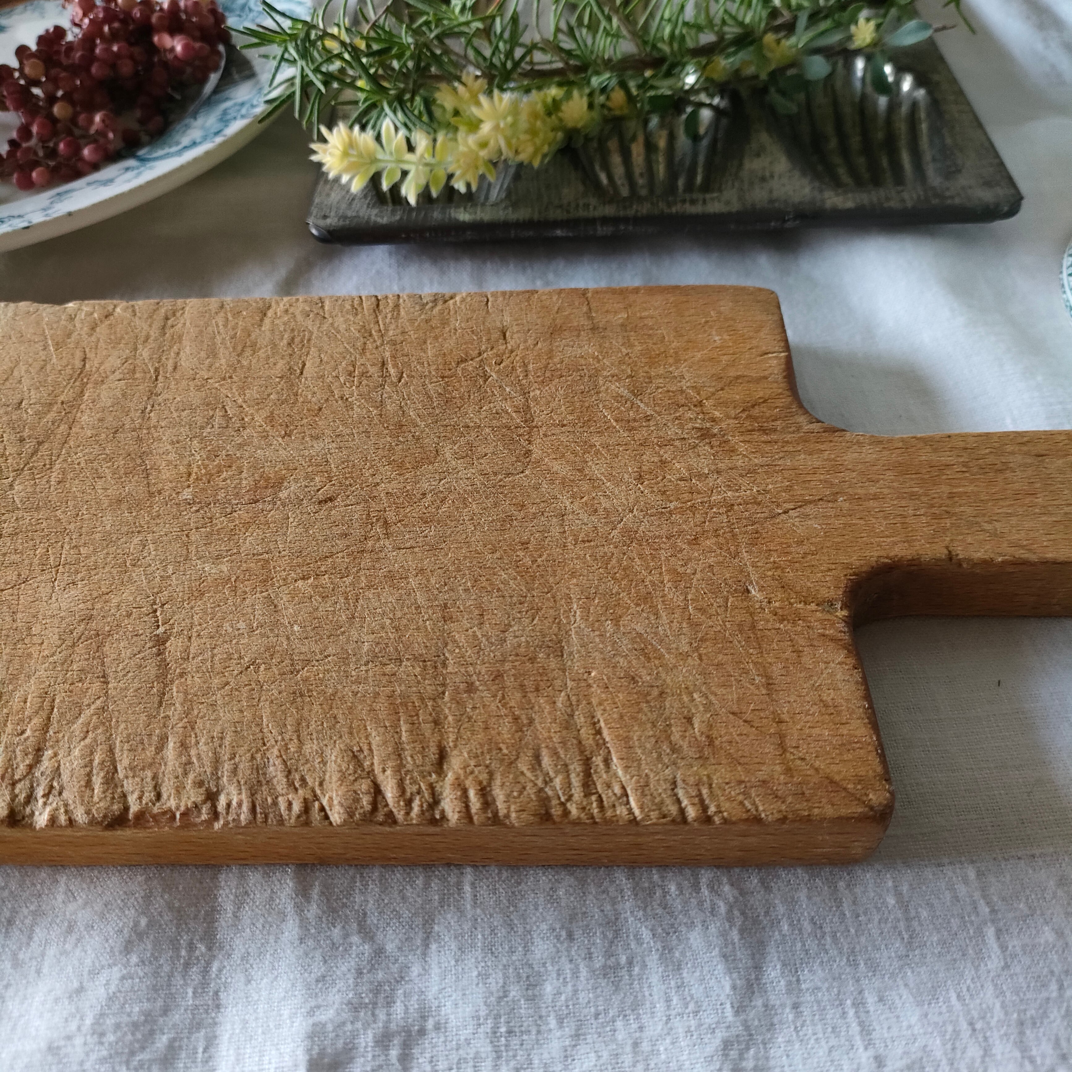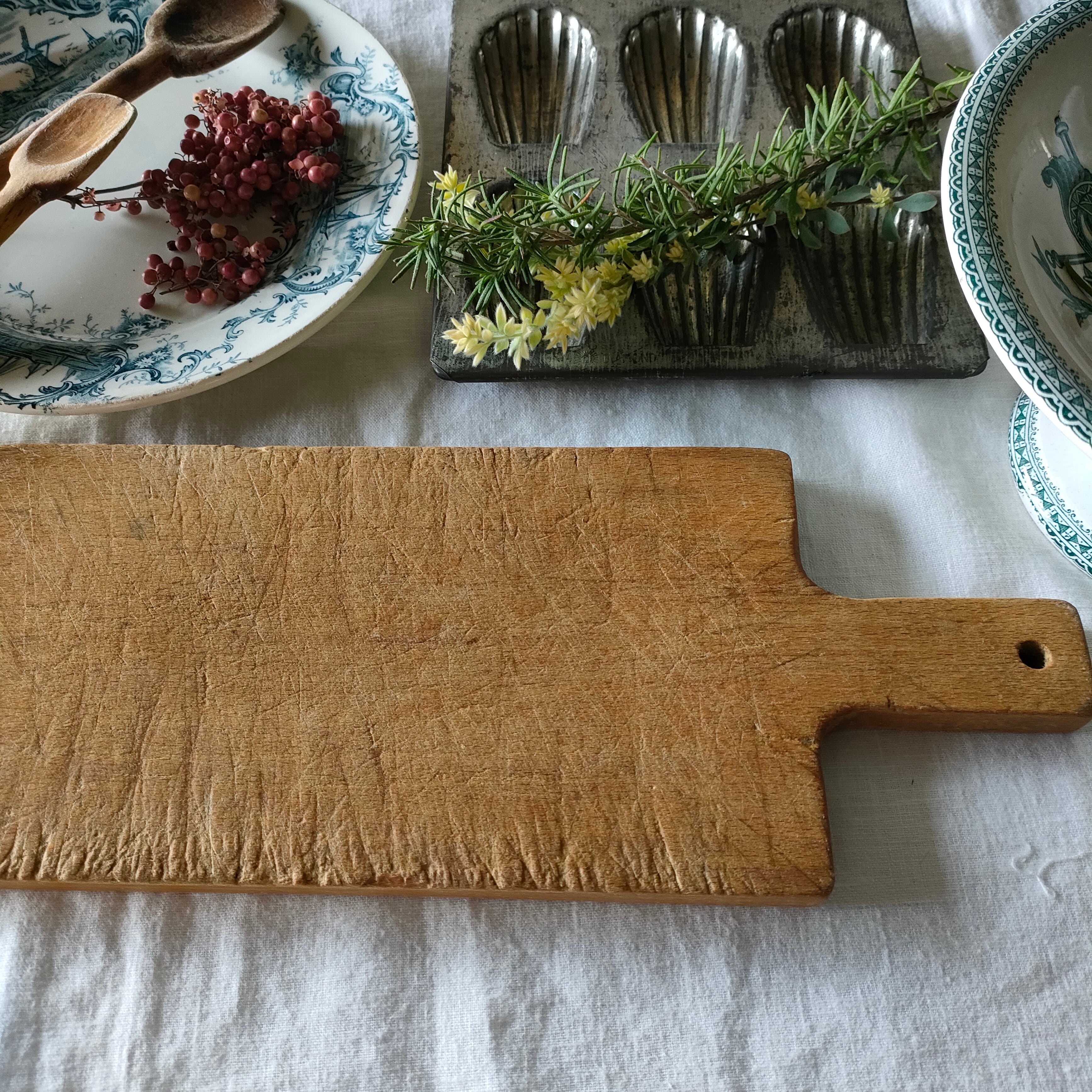 使い込まれた、歴史を感じる美しい空気感からは、とても長く長く愛されていたことを感じますね。手に触れることで、フランスのなんともあたたかい背景を感じられるような…そんなカッティングボードです。