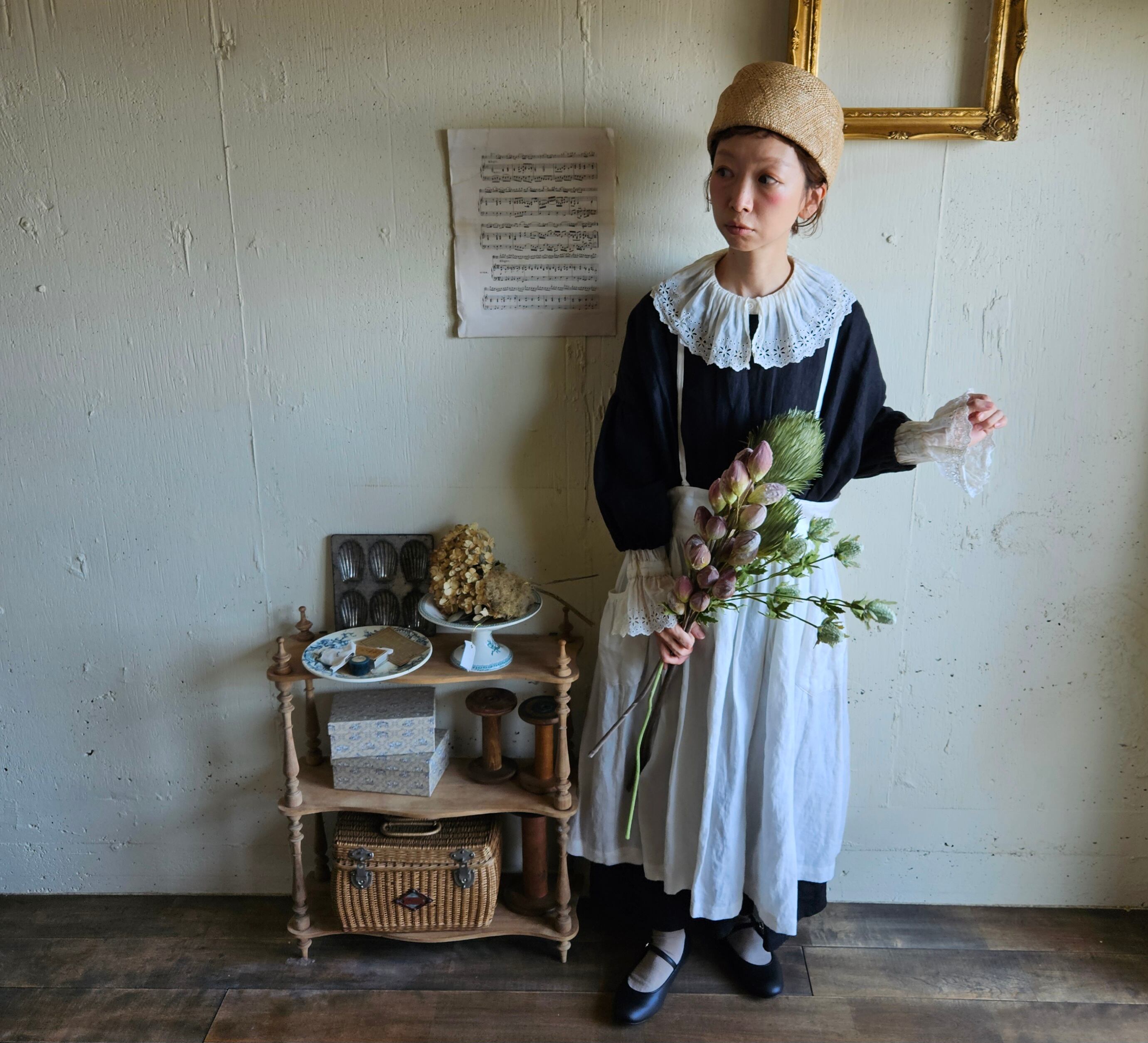 【即納サンプル品】Ecru White 2way サスペンダーギャザータブリエ French Linen Gather tablier フレンチリネンタブリエ タブリエエプロン アンティークタブリエ リネンタブリエ